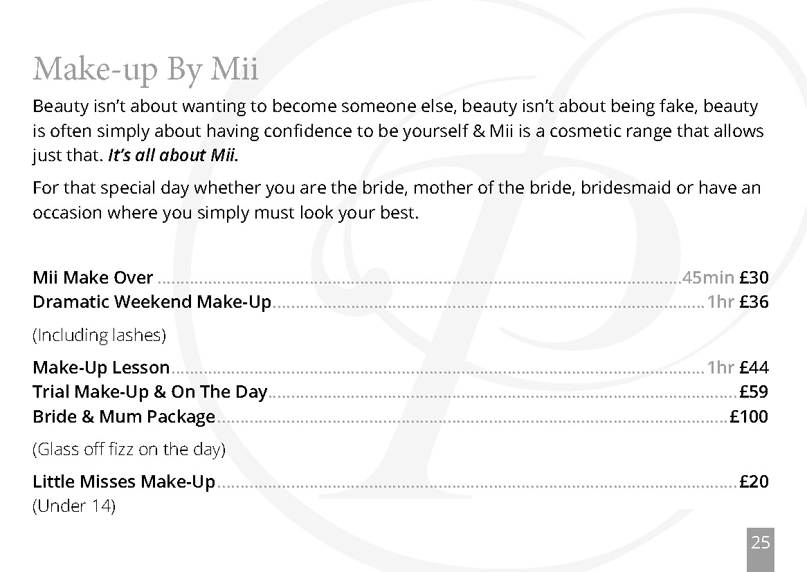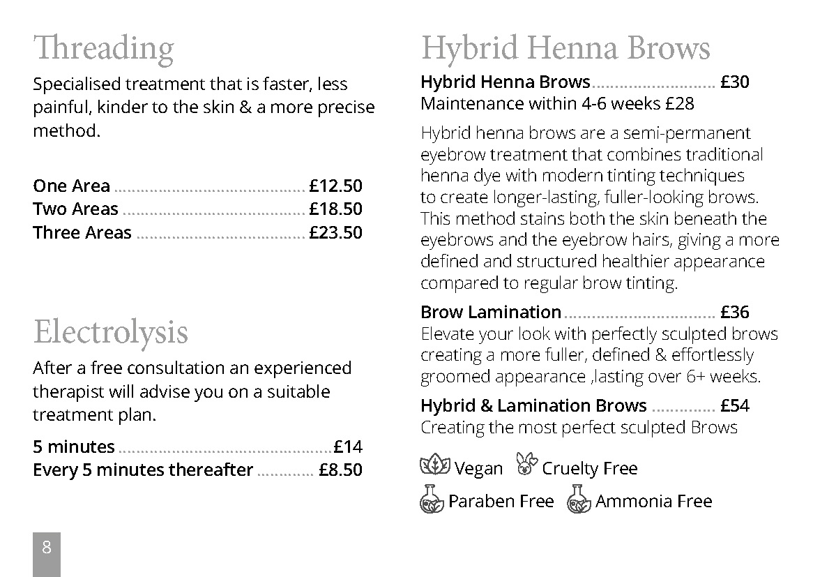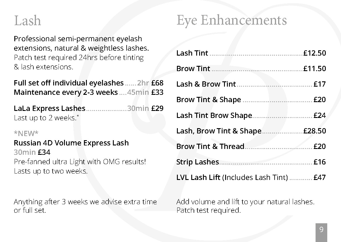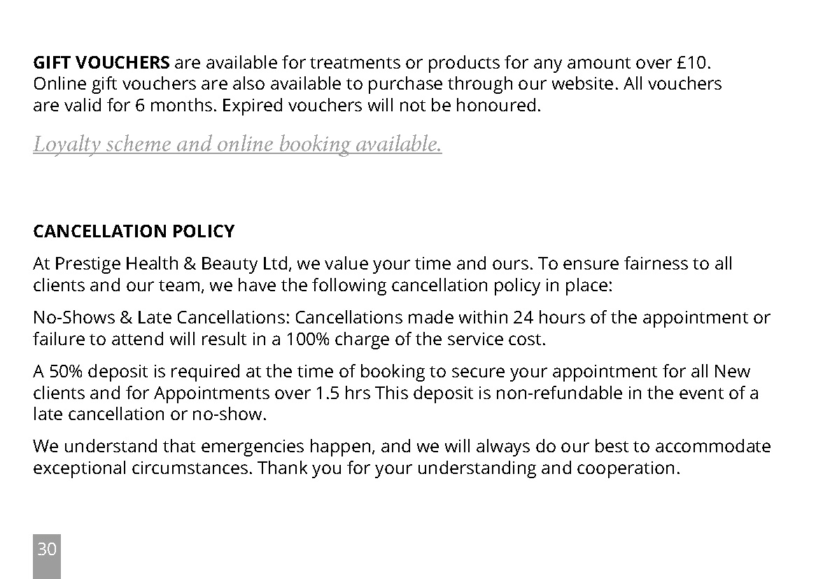 Full charge will be incurred for missed appointments or cancellations made with less than 24hrs notice. 50% for cancellations with 24hrs notice. 50% deposit for all new customers and any appointments over 1hr. We regret that if you arrive late for your appointment, treatment time will be reduced. There can be no refunds on pre-paid courses. Deposits will be required from all new clients.